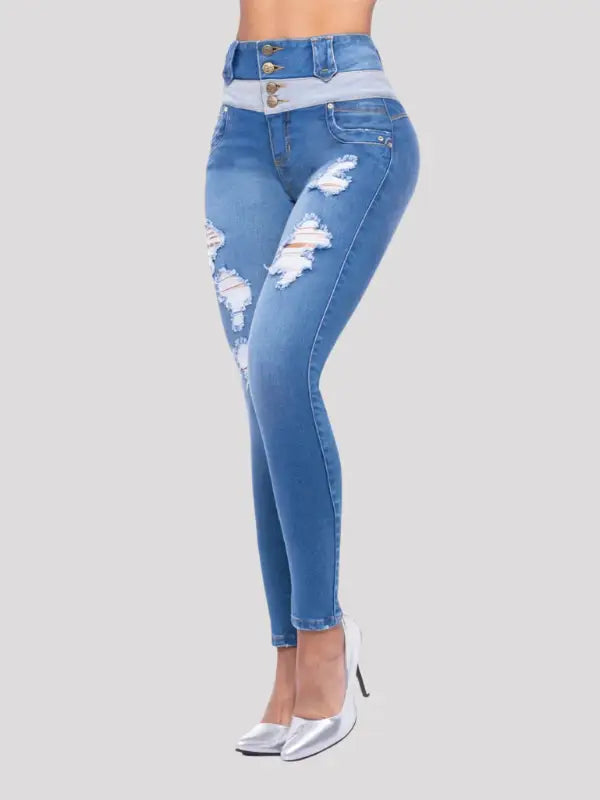Diseñado para resaltar tu figura con poder y precisión. Este jean levanta los glúteos, define las piernas y estiliza la cadera gracias a su corte entallado y tiro alto con doble pretina. Su efecto de presión controlada en el abdomen aporta firmeza sin sacrificar comodidad. El acabado desgarrado añade un toque urbano y atrevido, ideal para mujeres que combinan estilo con seguridad.