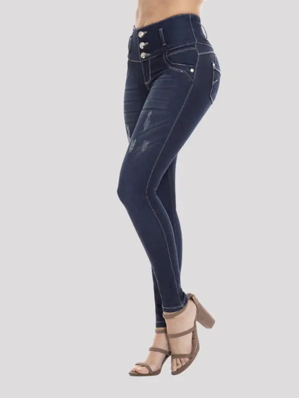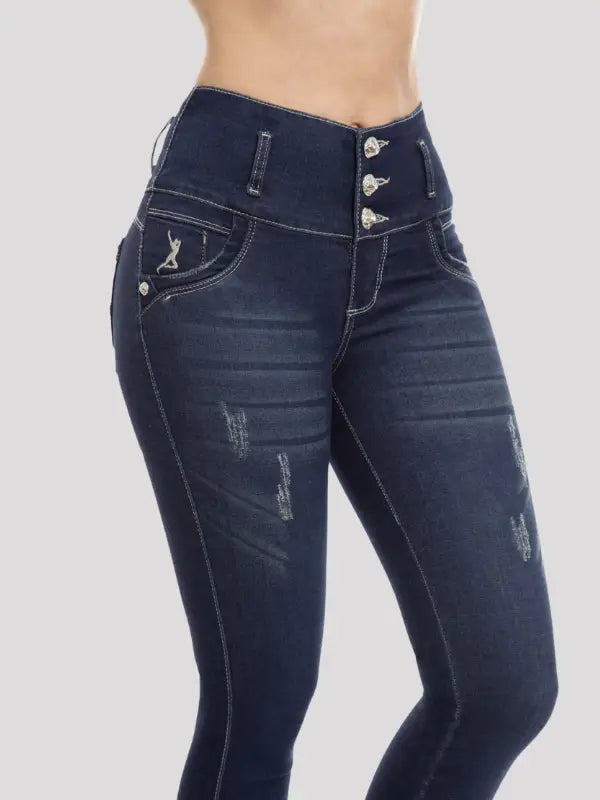 Descubre el poder del ajuste perfecto con nuestro jean Levanta Cola PUSH-UP. Diseño de talle alto con triple botón frontal, bolsillos decorativos y costuras estratégicas que realzan tu figura con estilo.