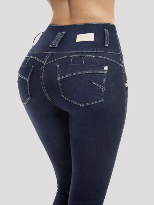Realza tu figura con nuestro jean Levanta Cola PUSH‑UP, diseñado para moldear, estilizar y acompañar cada movimiento con comodidad. Confeccionado en denim stretch 100% colombiano, una mezcla de algodón, poliéster y elastano que aporta suavidad, resistencia y un ajuste moldeador natural. Su talle alto con triple botón, bolsillos decorativos y costuras estratégicas crean un efecto visual que favorece la cintura y realza los glúteos.